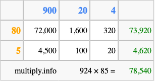Finally, we add up all the sums we found in step 3 to get our final answer to 924 times 85.