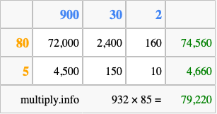 Finally, we add up all the sums we found in step 3 to get our final answer to 932 times 85.