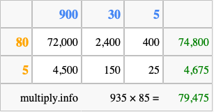 Finally, we add up all the sums we found in step 3 to get our final answer to 935 times 85.