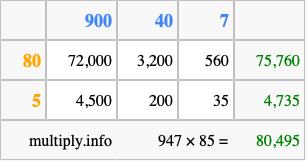 Finally, we add up all the sums we found in step 3 to get our final answer to 947 times 85.