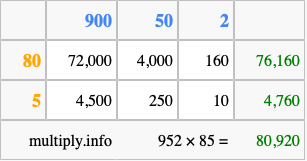 Finally, we add up all the sums we found in step 3 to get our final answer to 952 times 85.