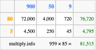 Finally, we add up all the sums we found in step 3 to get our final answer to 959 times 85.