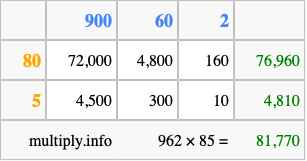 Finally, we add up all the sums we found in step 3 to get our final answer to 962 times 85.