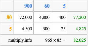 Below is an illustration showing you how to calculate 965 times 85 using the box method, using the instructions above.