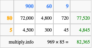 Finally, we add up all the sums we found in step 3 to get our final answer to 969 times 85.