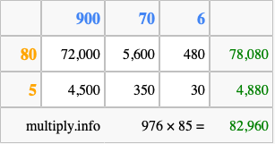 Finally, we add up all the sums we found in step 3 to get our final answer to 976 times 85.