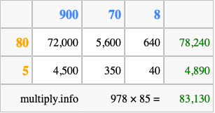 That's all there is to it! As you can see from the box above, the answer to 978 times 85 using the box method is 83,130.