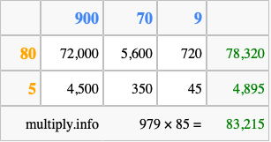 Finally, we add up all the sums we found in step 3 to get our final answer to 979 times 85.