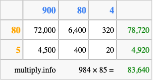 Finally, we add up all the sums we found in step 3 to get our final answer to 984 times 85.