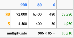 Finally, we add up all the sums we found in step 3 to get our final answer to 986 times 85.