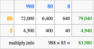 Below is an illustration showing you how to calculate 988 times 85 using the box method, using the instructions above.