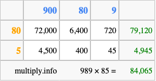 Finally, we add up all the sums we found in step 3 to get our final answer to 989 times 85.