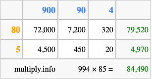Finally, we add up all the sums we found in step 3 to get our final answer to 994 times 85.