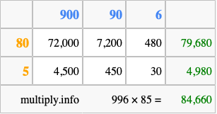 Below is an illustration showing you how to calculate 996 times 85 using the box method, using the instructions above.