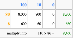 Below is an illustration showing you how to calculate 110 times 86 using the box method, using the instructions above.