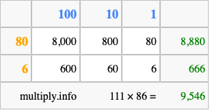 Finally, we add up all the sums we found in step 3 to get our final answer to 111 times 86.