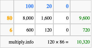 Finally, we add up all the sums we found in step 3 to get our final answer to 120 times 86.