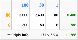 Below is an illustration showing you how to calculate 131 times 86 using the box method, using the instructions above.