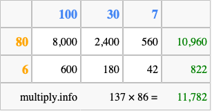 Below is an illustration showing you how to calculate 137 times 86 using the box method, using the instructions above.