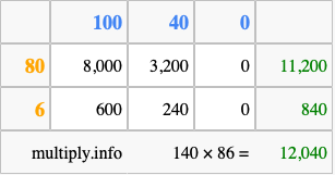 Finally, we add up all the sums we found in step 3 to get our final answer to 140 times 86.