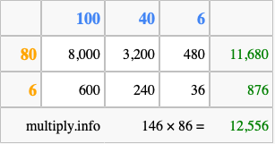 That's all there is to it! As you can see from the box above, the answer to 146 times 86 using the box method is 12,556.