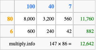Finally, we add up all the sums we found in step 3 to get our final answer to 147 times 86.