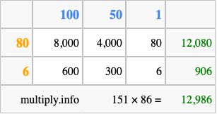 Finally, we add up all the sums we found in step 3 to get our final answer to 151 times 86.