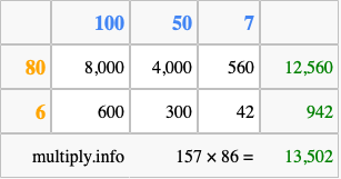 That's all there is to it! As you can see from the box above, the answer to 157 times 86 using the box method is 13,502.
