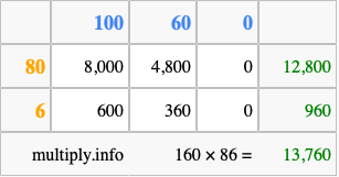 Finally, we add up all the sums we found in step 3 to get our final answer to 160 times 86.