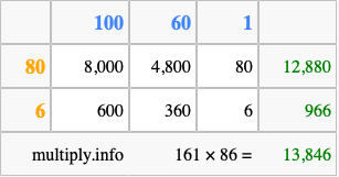 Finally, we add up all the sums we found in step 3 to get our final answer to 161 times 86.