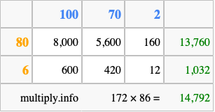 That's all there is to it! As you can see from the box above, the answer to 172 times 86 using the box method is 14,792.