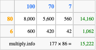 That's all there is to it! As you can see from the box above, the answer to 177 times 86 using the box method is 15,222.