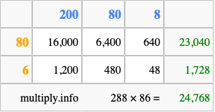 Finally, we add up all the sums we found in step 3 to get our final answer to 288 times 86.