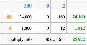 Finally, we add up all the sums we found in step 3 to get our final answer to 302 times 86.
