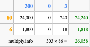 That's all there is to it! As you can see from the box above, the answer to 303 times 86 using the box method is 26,058.