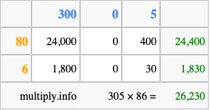 Finally, we add up all the sums we found in step 3 to get our final answer to 305 times 86.