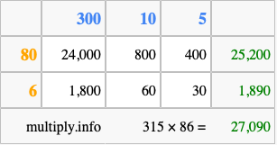 Finally, we add up all the sums we found in step 3 to get our final answer to 315 times 86.