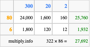Finally, we add up all the sums we found in step 3 to get our final answer to 322 times 86.