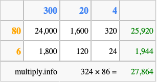 Finally, we add up all the sums we found in step 3 to get our final answer to 324 times 86.