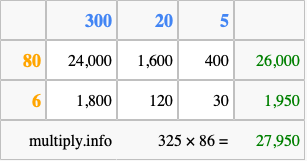 Finally, we add up all the sums we found in step 3 to get our final answer to 325 times 86.