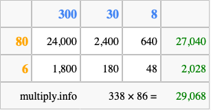 Finally, we add up all the sums we found in step 3 to get our final answer to 338 times 86.