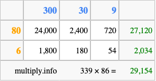 Finally, we add up all the sums we found in step 3 to get our final answer to 339 times 86.