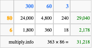 Finally, we add up all the sums we found in step 3 to get our final answer to 363 times 86.