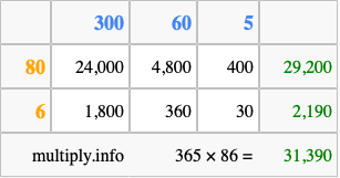 Finally, we add up all the sums we found in step 3 to get our final answer to 365 times 86.