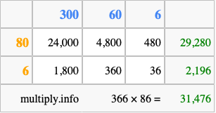 Finally, we add up all the sums we found in step 3 to get our final answer to 366 times 86.