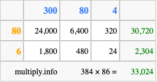 Finally, we add up all the sums we found in step 3 to get our final answer to 384 times 86.