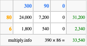 Finally, we add up all the sums we found in step 3 to get our final answer to 390 times 86.