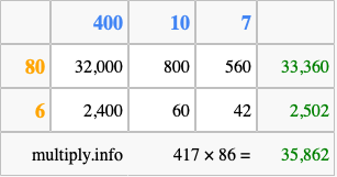 Finally, we add up all the sums we found in step 3 to get our final answer to 417 times 86.