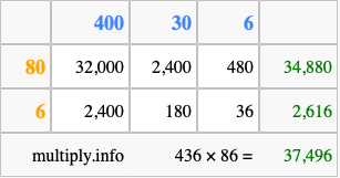 Finally, we add up all the sums we found in step 3 to get our final answer to 436 times 86.