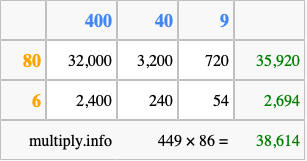 Finally, we add up all the sums we found in step 3 to get our final answer to 449 times 86.